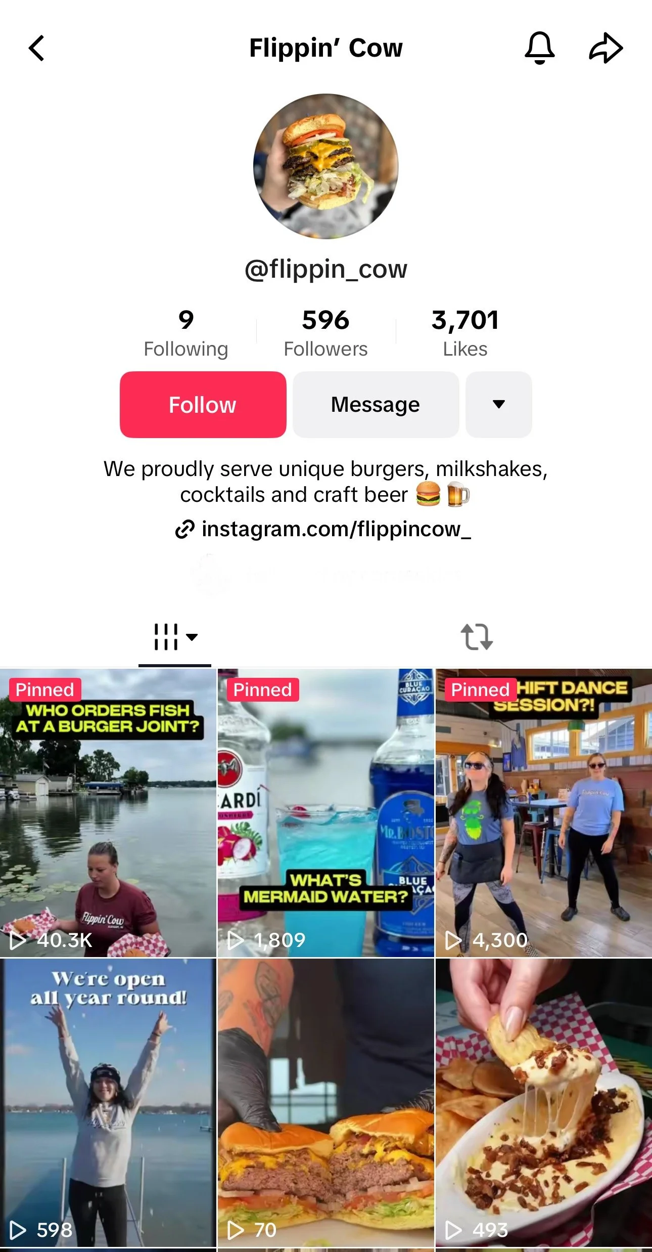 Flippin’ Cow Burger Joint is a lakeside restaurant specializing in burgers, comfort foods, and cocktails. With Flippin’ Cow, I proactively handled content planning 7 days a week/3 posts per day for Facebook and Instagram. 1 post per day on LinkedIn, and weekly on TikTok.